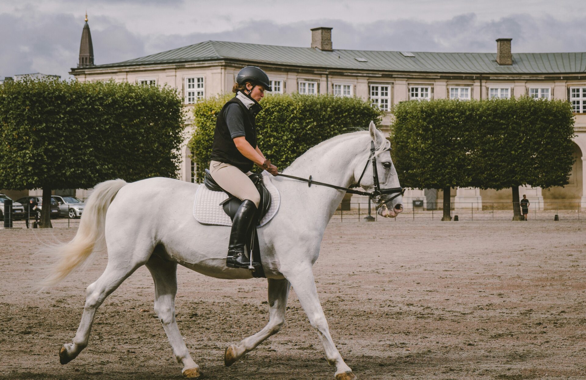 会場での馬の慣れさせ方も大事で、いきなりウォームアップを始めるんじゃなくて、まず馬に周りを見せてあげる時間を作ってください。
